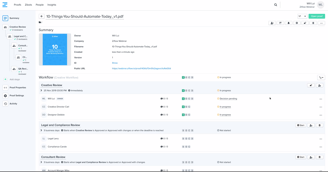 In many cases, creative assets first need to be reviewed internally before being shared with external team members or clients. As you can see above, Ziflow’s review workflows make it possible to easily control when clients receive content for review.