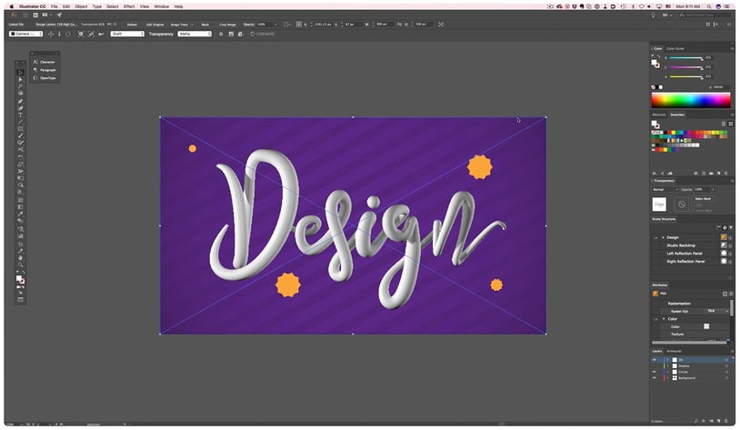 - Materials: Adjust the color, reflection, luminance, transparency, and bump with Adobe Illustrator.
