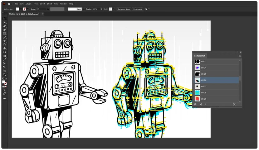 With VectorGlitch, you can instantly add a glitched style to your vector art using raster-based distortion. Choose from 60 pure-vector graphic styles that are infinitely scalable and remain editable after being applied.