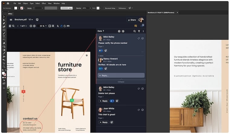 Bouncing out of Illustrator to dig feedback out of email, Slack, Teams, and other tools interrupts the creative flow. With the Ziflow plugin for Adobe Illustrator, team members can stay in their creative zone, receiving and engaging in feedback without having to leave Illustrator.