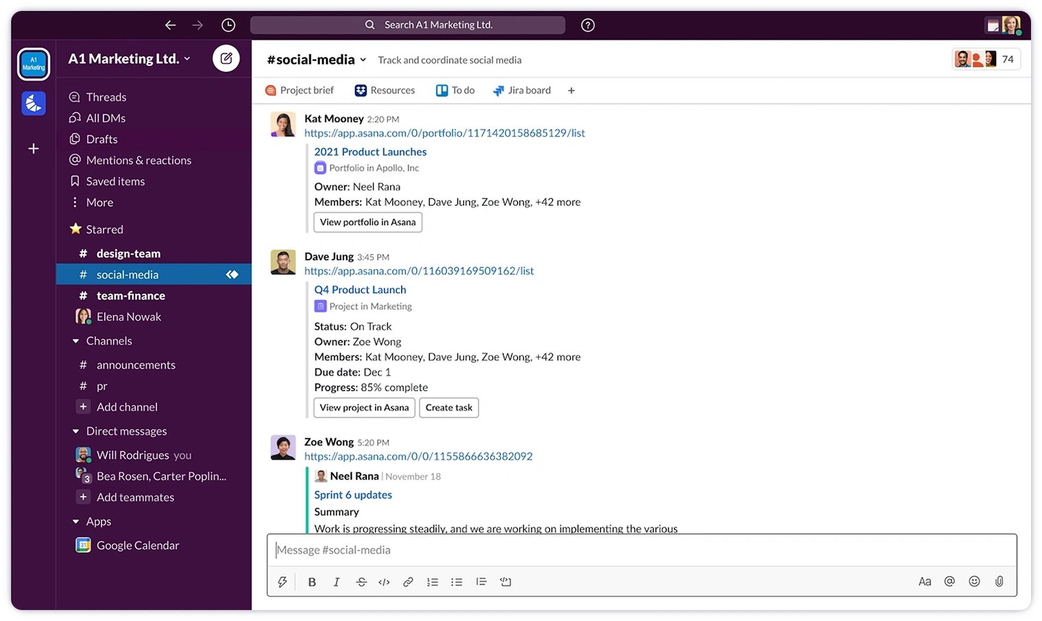 Directly create Asana tasks from Slack messages. This feature is especially useful during brainstorming sessions or when actionable items arise from discussions.