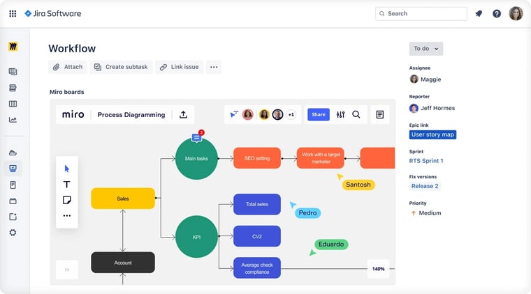 Miro integration turns Jira into a more dynamic platform where teams can visually collaborate on projects.