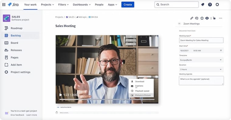 Zoom integration with Jira facilitates virtual meetings that are linked directly to project tasks, making it easy to discuss details without leaving the project management environment.