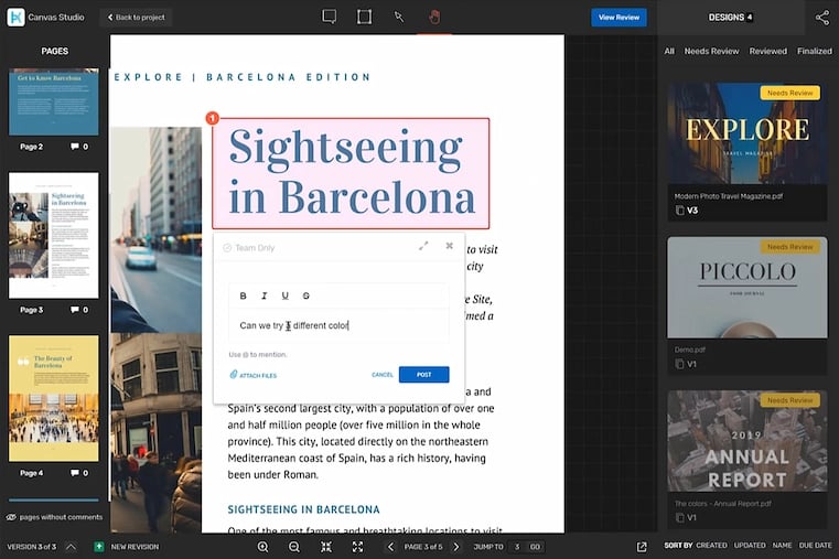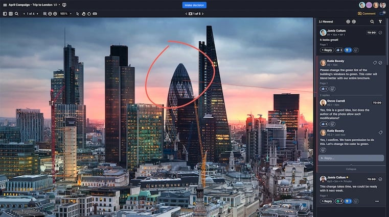 Montreal, Canada is homebase for ReviewStudio, with a remote team of 10 spread out from Lisbon to the UK. Its goal is to make online proofing straightforward, with decent features for commenting, managing tasks, comparing versions, and a dab of automated workflow. It’s mostly geared toward small and mid-sized businesses.