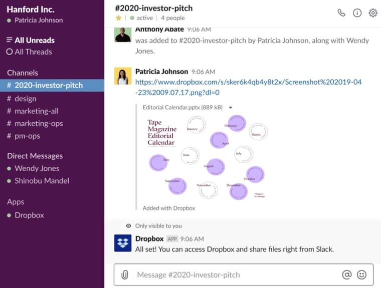 • Share a Dropbox link in Slack to automatically display a rich preview of the file content, allowing team members to view the information without leaving the conversation.