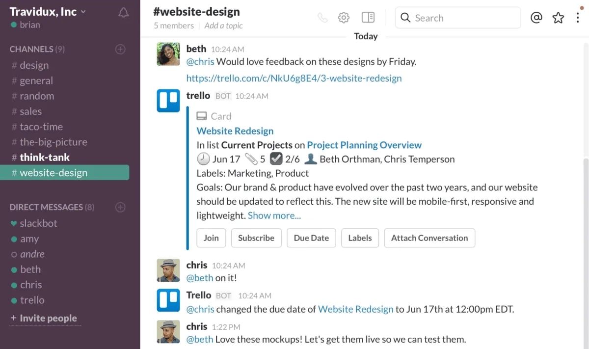 Similar to Asana, Trello’s Slack integration can convert creative conversations into structured tasks and projects, directly from Slack. Ideas and comments won’t slip through the cracks, and projects can stay on track.