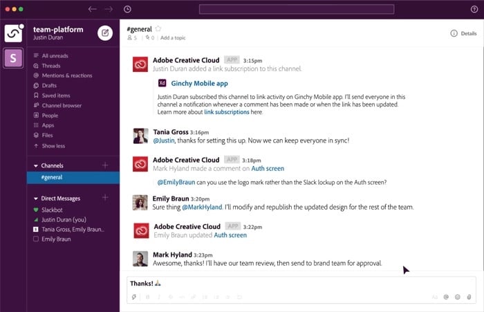 • Receive updates directly in Slack when changes are made to files, comments are added, or tasks are updated in Adobe Creative Cloud.