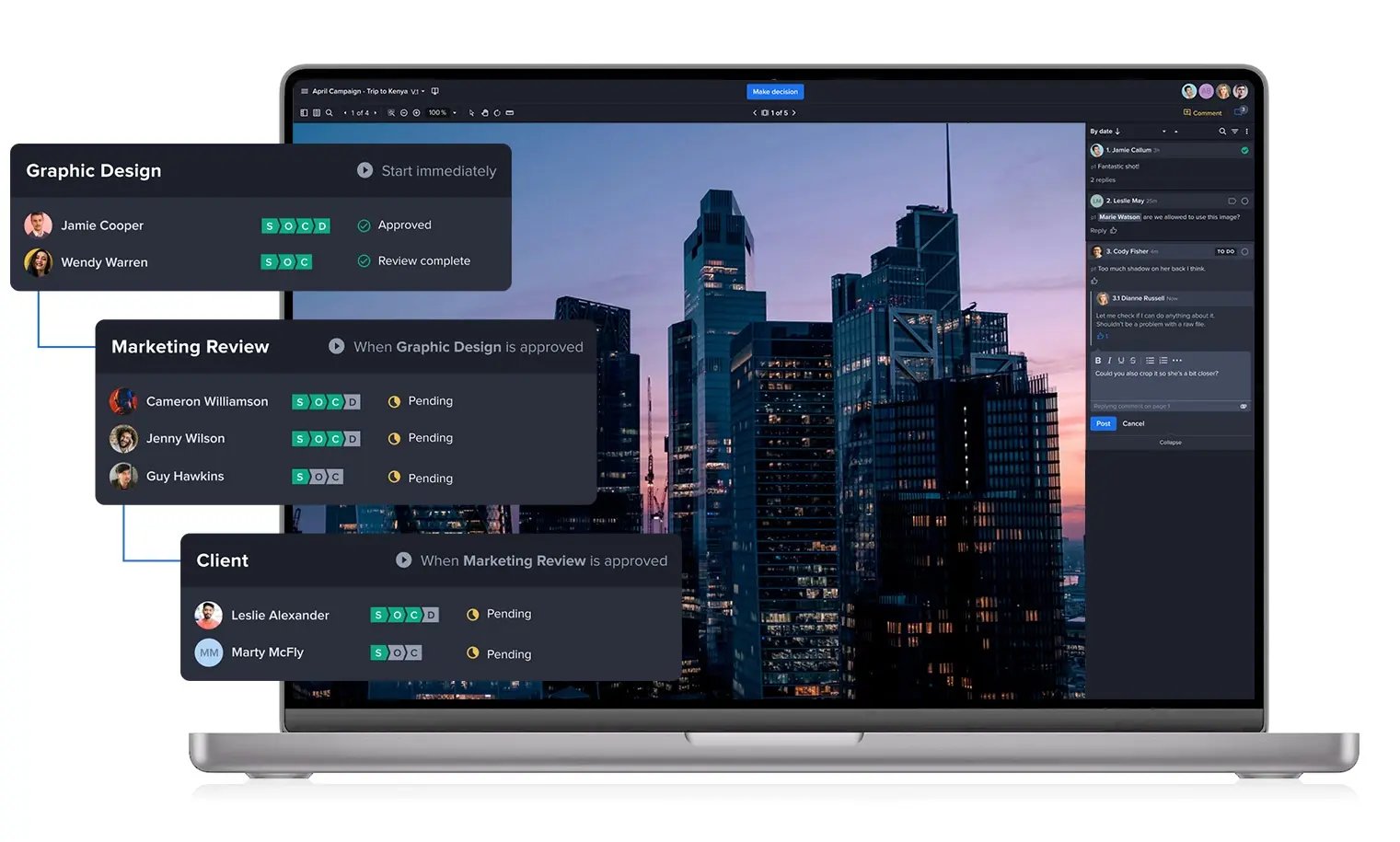 These tools provide a unified platform where team marketing department members and project stakeholders can annotate, comment, and approve materials and brand elements in real time. This ensures that all content aligns with brand standards before publication, speeding up the review process and significantly improving accuracy and efficiency.