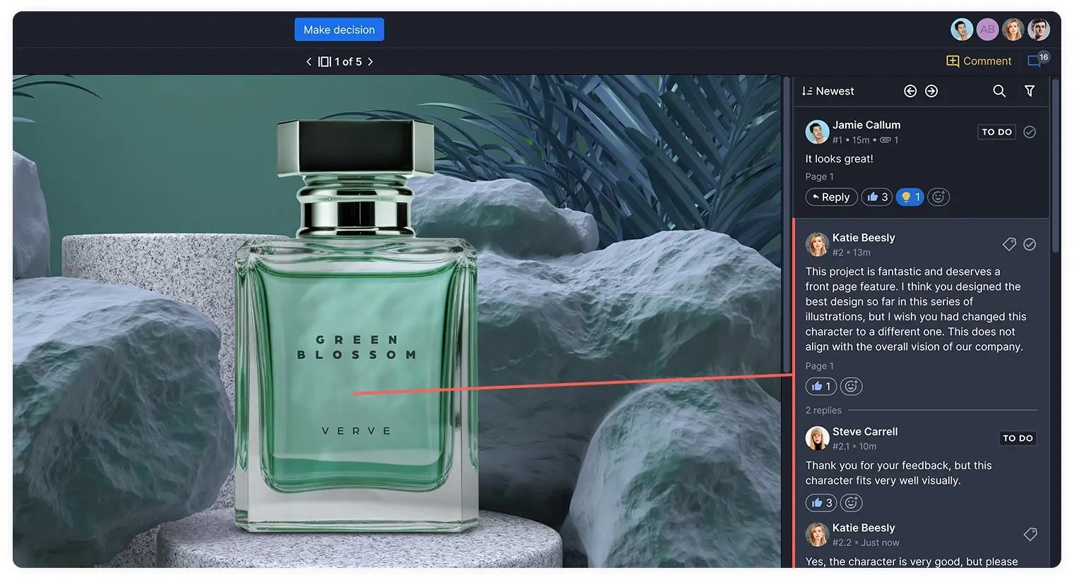Rather than spending time in endless meetings or digging through disjointed email threads, feedback is more effective when it's tied to specific elements of a creative asset. Design collaboration tools make it possible to pinpoint design feedback on creative assets — highlighting specific details, tagging the right person for the task, and offering clear suggestions.