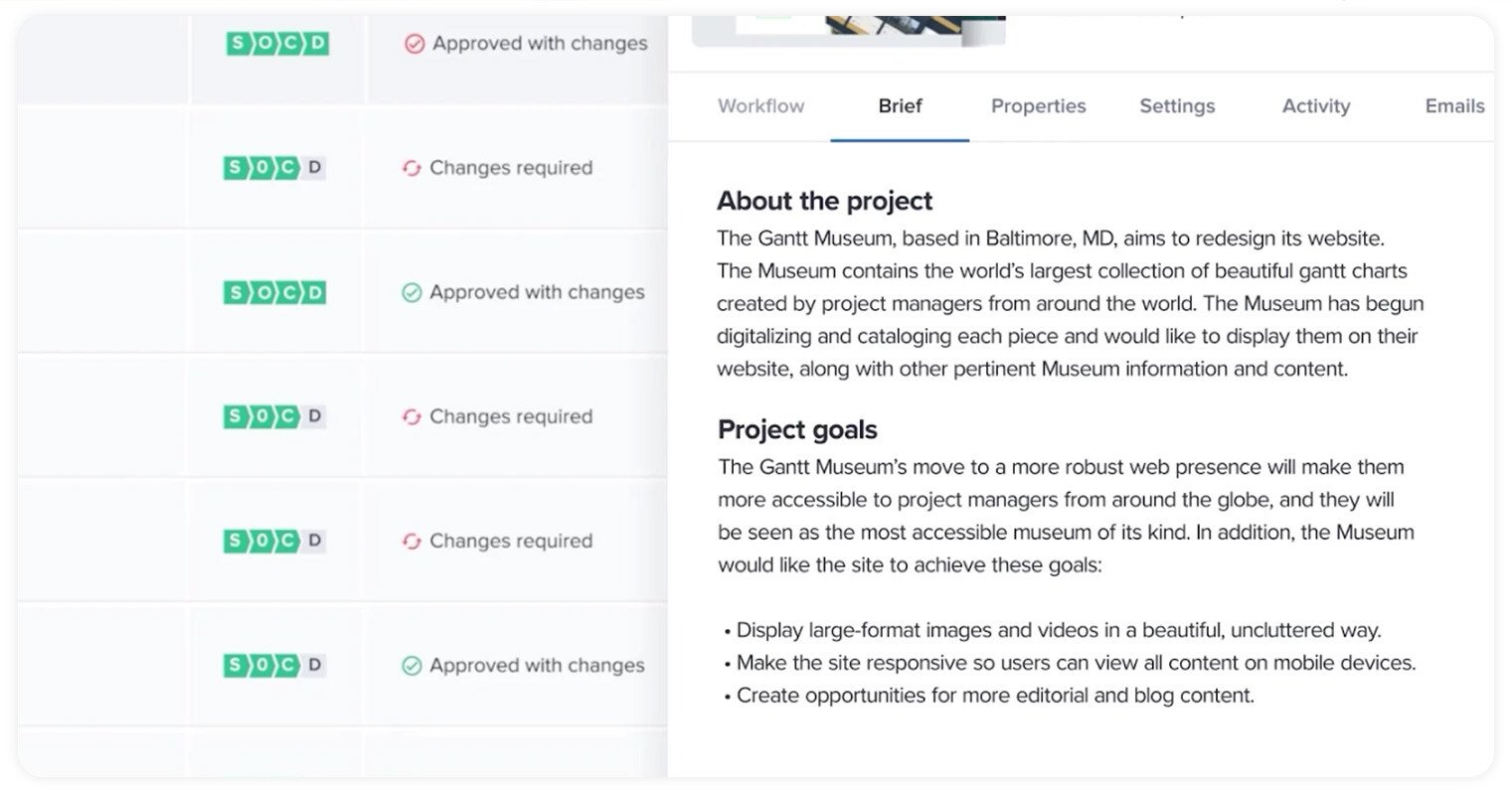 Creative teams need to be able to reference the original approved project goals and design requirements as they work on a project. This helps keep designs on track and prevent the dreaded "scope creep" should clients request new design elements.