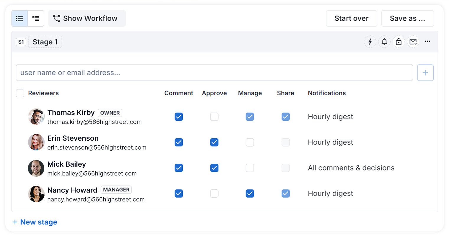 For effective creative collaboration, we recommend creating individual review groups for management, developers, and creatives, so they can each conduct reviews at different stages of the process. You can also invite set permissions about who can view, comment on, and make decisions on a design.