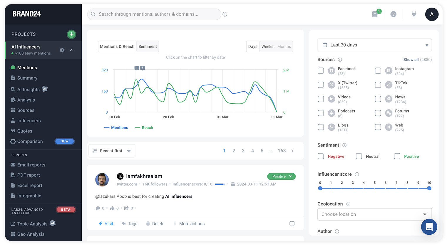 Brand24 is an AI social listening tool that helps companies protect their brand reputation and measure brand awareness. Tracking brand mentions helps you understand what people are saying about your brand across social media, news, blogs, videos, forums, podcasts, reviews, and more.