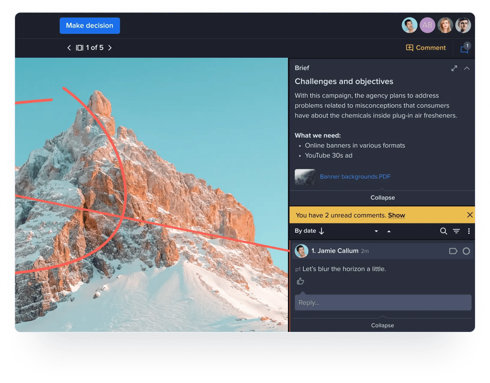 To save designers the frustration (and time), attach or include short briefs with each asset you send for feedback so that reviewers can quickly get up to speed and provide the necessary input. You’ll cut out unnecessary conversations and meetings where you rehash the purpose for a particular piece of creative, and curate the feedback you want for your design workflow process. The evolution of a design is also easier to digest for reviewers entering the process mid-stream, and they can understand the work that went into previous iterations.