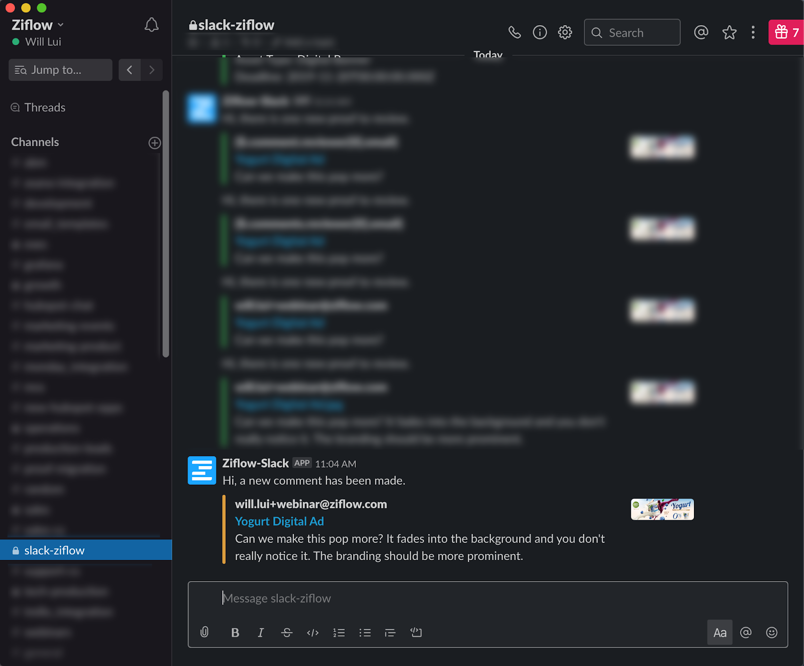 When a new ad is created in the company’s Ziflow account, the Slack Zibot: