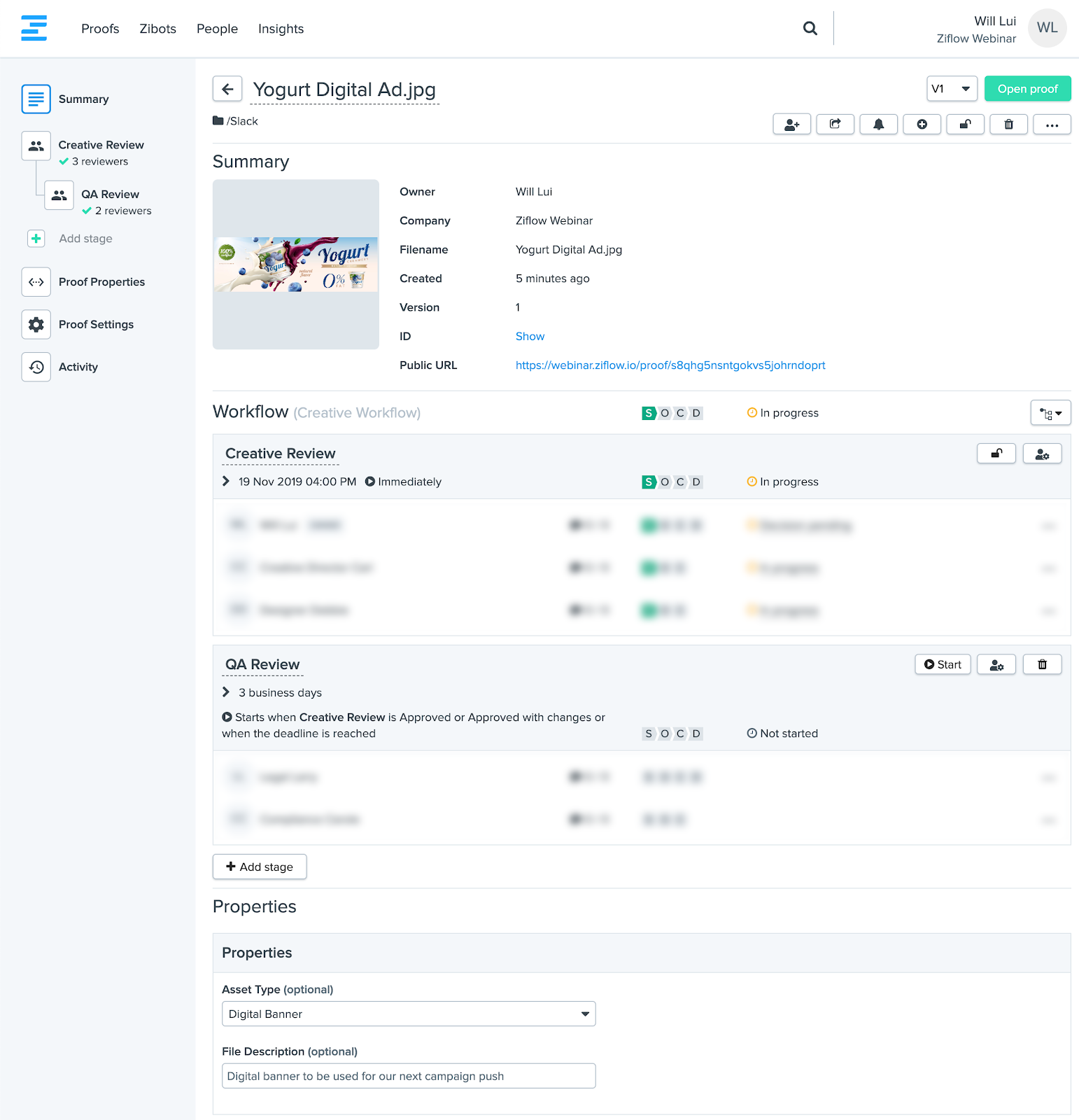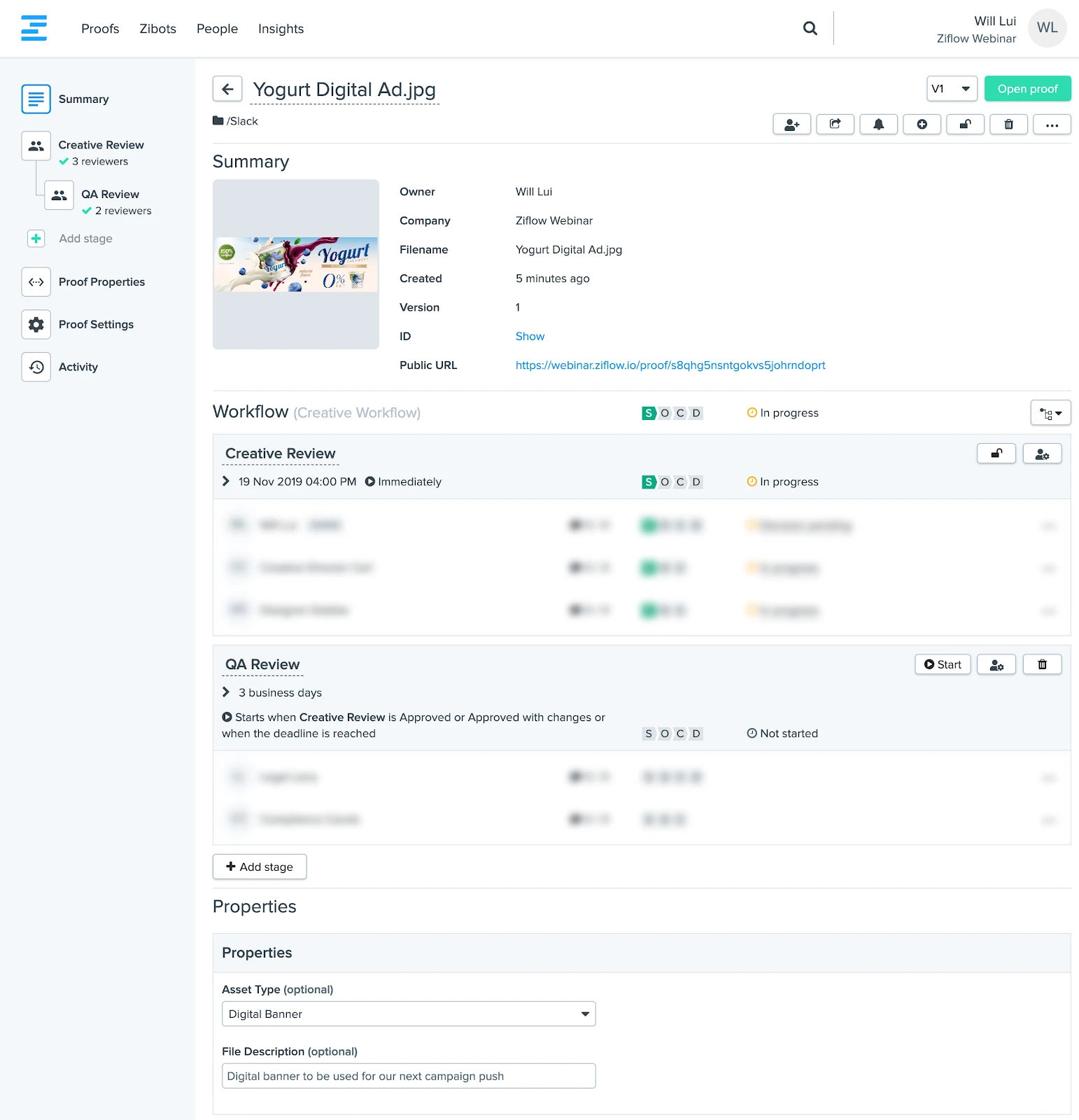 - When the reviewer works with the content in Ziflow, Basecamp tasks are updated and Slack notifications are sent as progress is made on the proof.