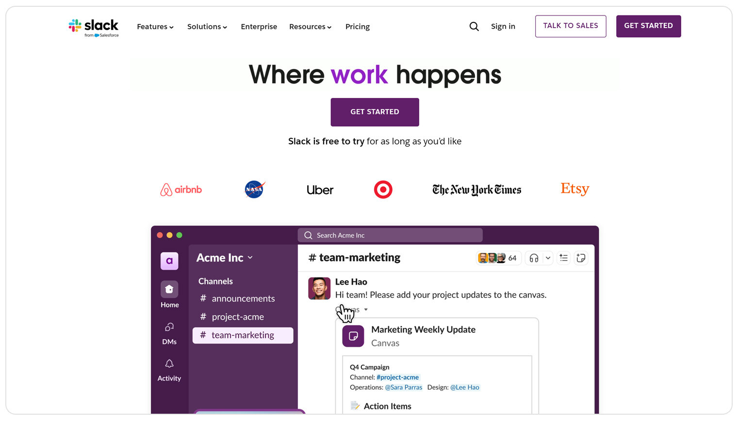- Channels for organizing team conversations by topic or project.