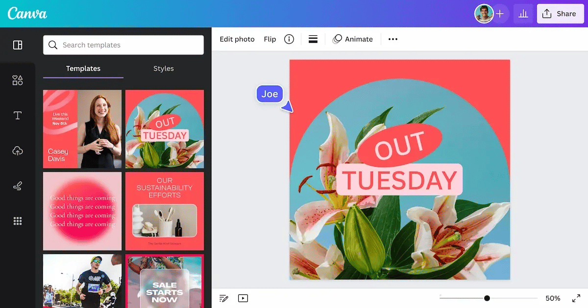 Make collaborating on digital assets simple with Canva. This online graphic design software allows you to create beautiful images, videos, and other marketing collateral. This is a fantastic choice for marketing teams that want to work together on designs and don’t need the full functionality of the Adobe Creative Suite.