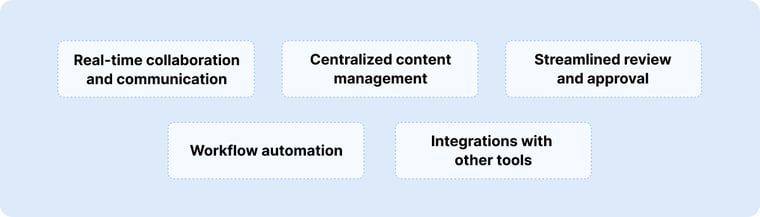 A tool is only as useful as its features. Your team’s specific needs may vary, but there are a few things every team needs: quick communication, straightforward content management, streamlined approvals, seamless automation, and robust integrations.
