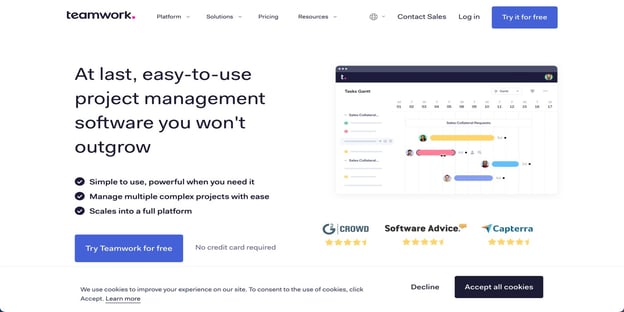 Teamwork allows for cross-project dependencies and includes budget forecasting features. The “Milestone” feature lets teams easily identify incremental goals within a longer project.