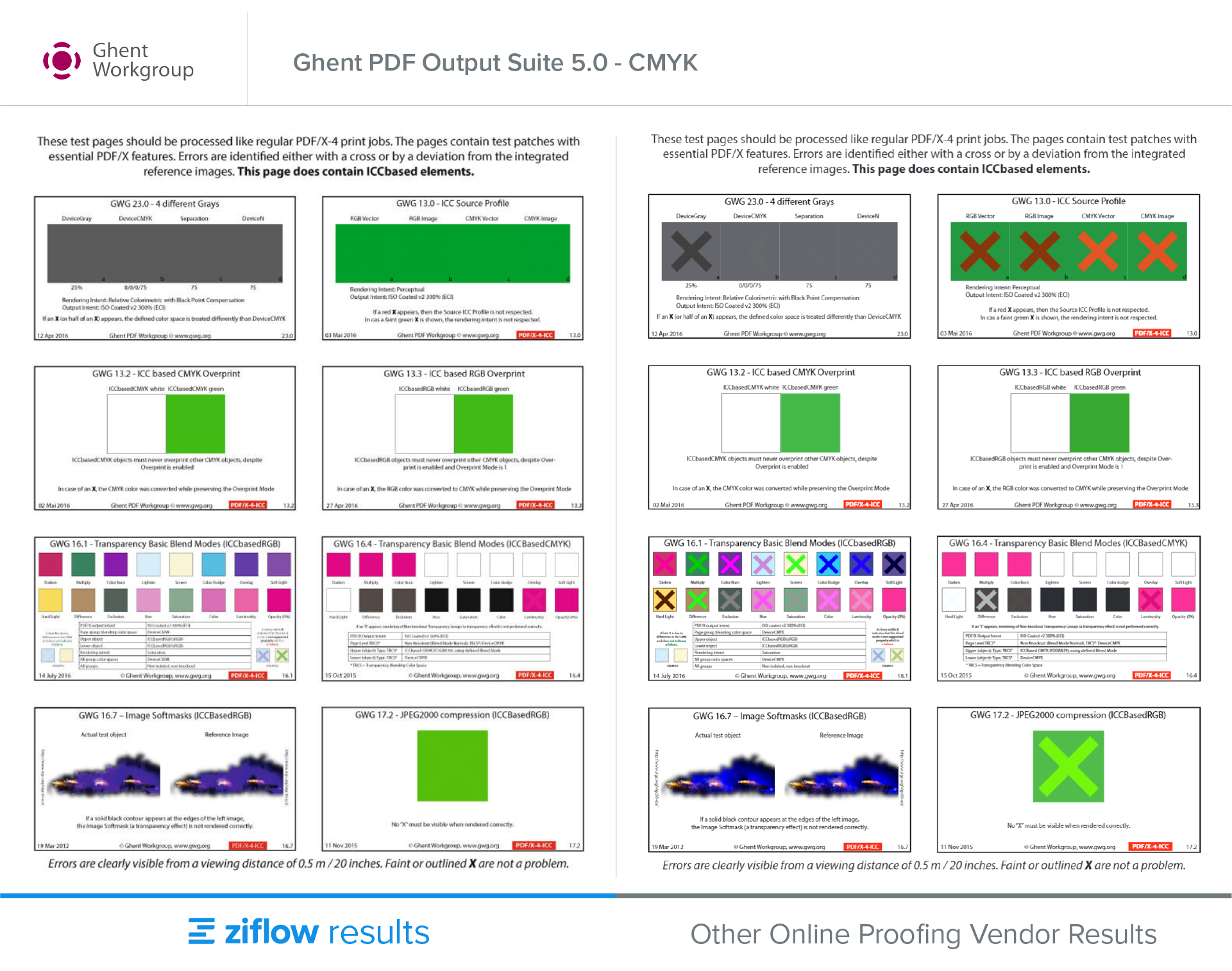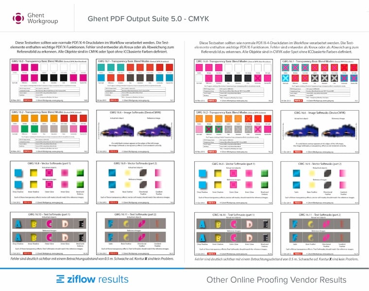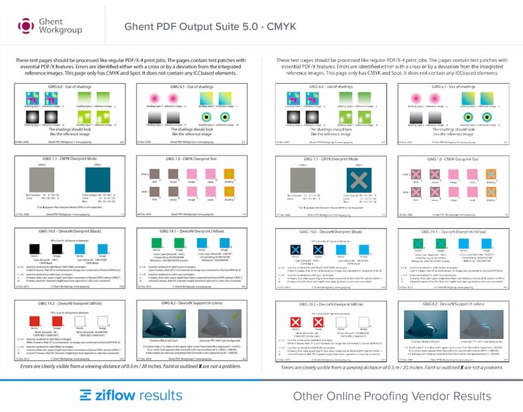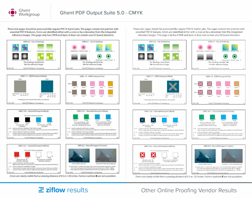 In all the screenshots Ziflow is on the left and another unnamed proofing application is on the right. The Ghent PDF Output Suite 5.0 file will show X (crosses) where the processing is incompatible. In all of these tests, you’ll notice that there are no X (crosses) at all in these images to the left, which means Ziflow processed it correctly.