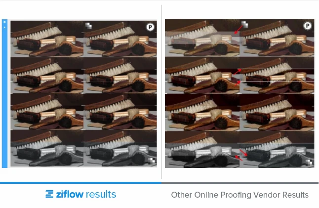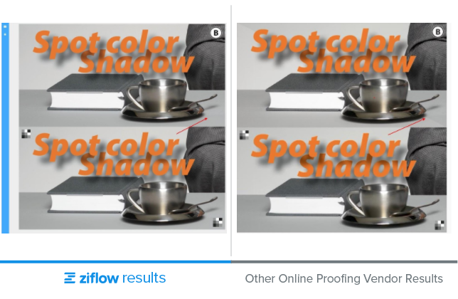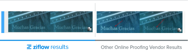 In these tests, you can see that other online proofing systems don’t offer the same level of PDF processing accuracy and speed as Ziflow. The quality of color accuracy, text, transparency and other properties can get drastically modified from an original PDF file when converting into a PDF proof for review.