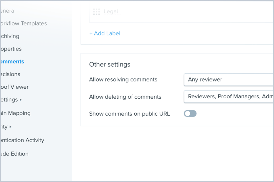 When sending a proof outside of the organization, external reviewers often don’t need or shouldn’t have access to all of the comments on proofs. To further improve the internal-external review process, administrators can now disable the visibility of comments on proofs opened from Public URLs. This setting will mask comments on all public proof links.