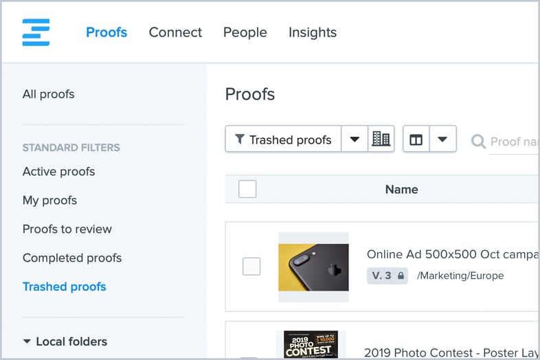 It’s happened to even the most organized teams: proofs are accidentally deleted by mistake or previously deleted proofs need to be restored. In order to save users time when relocating deleted proofs, we’ve created a new Standard Filter for “Trashed Proofs” that provides users with a self-service method for immediately finding and restoring deleted proofs in their account.