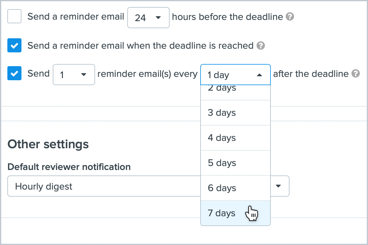 Automated reminders about late proofs reduce approval delays, but many organizations don’t need or want to send reminders to reviewers every single day. To better align automated reminders with specific deadline requirements, we’ve expanded the frequency options for late proof reminders from 24 hours to up to 7 days. Administrators can now choose to send late proof reminders every 7 days or more frequently, depending on turnaround preferences.