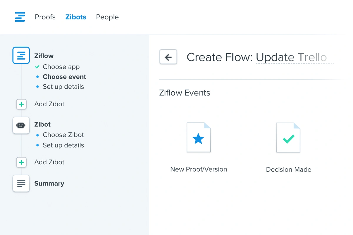 A new “Webhook” Zibot has also been developed that may then be used to call any publicly available API so you can easily integrate Ziflow with any of your favorite applications like Trello, Slack, Basecamp, Asana, Airtable and many more. For example, when a proof is approved in Ziflow, a Zibot is triggered and automatically updates the online proofing task on your Trello board keeping both systems seamlessly synchronized.