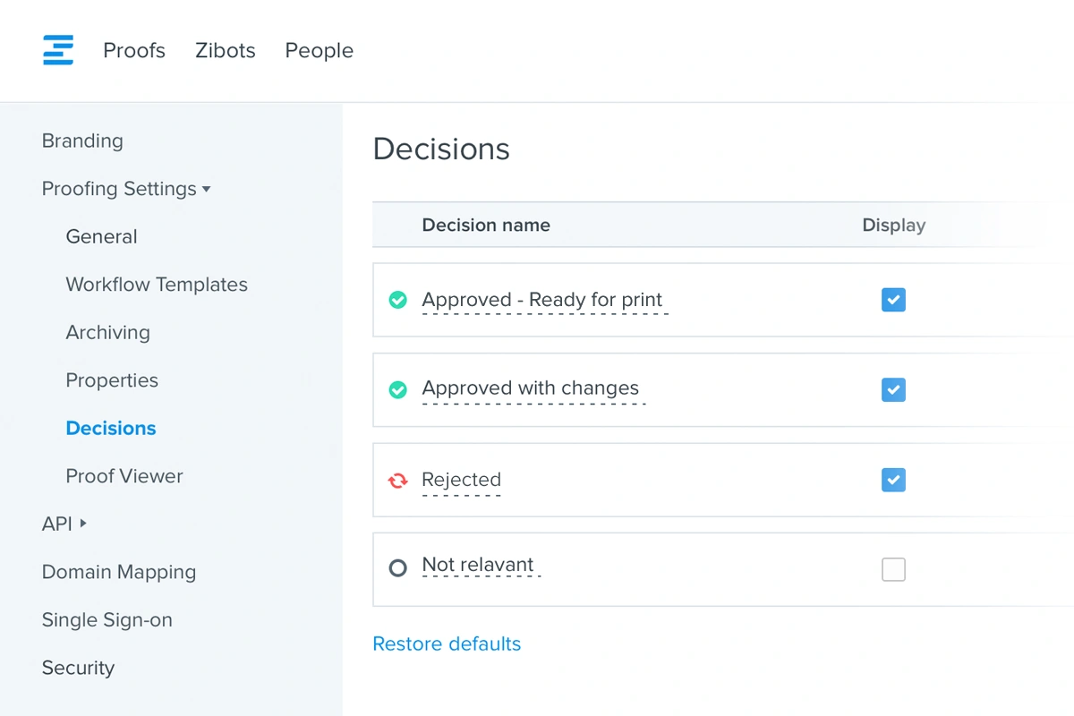 You can access this feature by going to Manage Account > Proofing Settings > Decisions and then clicking on the decision label.