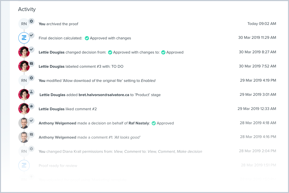 To this end, we've extended the proof activity section to capture all changes and actions on a proof. Now you'll be able to see exactly who made what change to the proof and when.