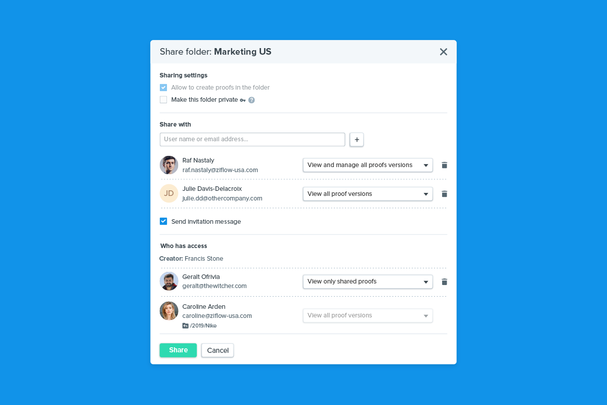 We've continued to build upon on our most recent releases by adding even more fine-grained control over folder-level permissions. With this release, we've updated the "View all proofs" and "View and Manage all proofs" options to include all proof versions, not just the latest version.
