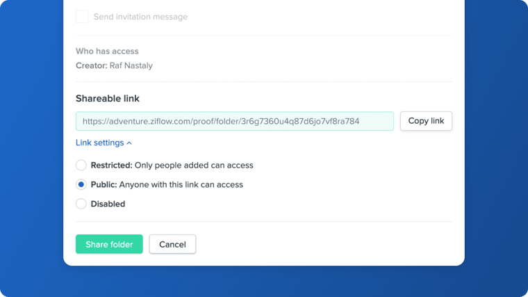 Every folder in Ziflow now has a shareable link, so you can easily share the folder with anyone. Copy and paste into an email, chat, or other messaging platforms. Recipients can see all the assets in the folder, which is useful when you add assets to a campaign or project folder over time. Recipients can also share the link with other people. Of course, you can still control permission settings on the individual assets.
