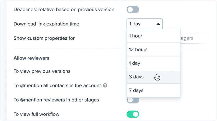 When downloading multiple assets at once, users receive an email notification with a link valid for one day to download the source assets. This enhancement lets users extend the link expiration duration between 1 hour and 7 days. Customizing expiration time gives account administrators security control while providing users with ease of access to assets.