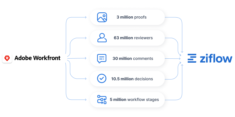 Ziflow has already migrated and synchronized close to 3 million proofs from Workfront Proof. Migration includes all proof versions, comments, replies, decisions, proof data, contacts, settings, and workflows. It also includes archived proofs. All data is migrated with the original dates, so you have an exact copy of the original proof. During the transition period, you can create proofs in both Workfront Proof and Ziflow and synchronize every activity in Workfront Proof across to Ziflow. This eases the transition process by having both systems up and running in parallel.