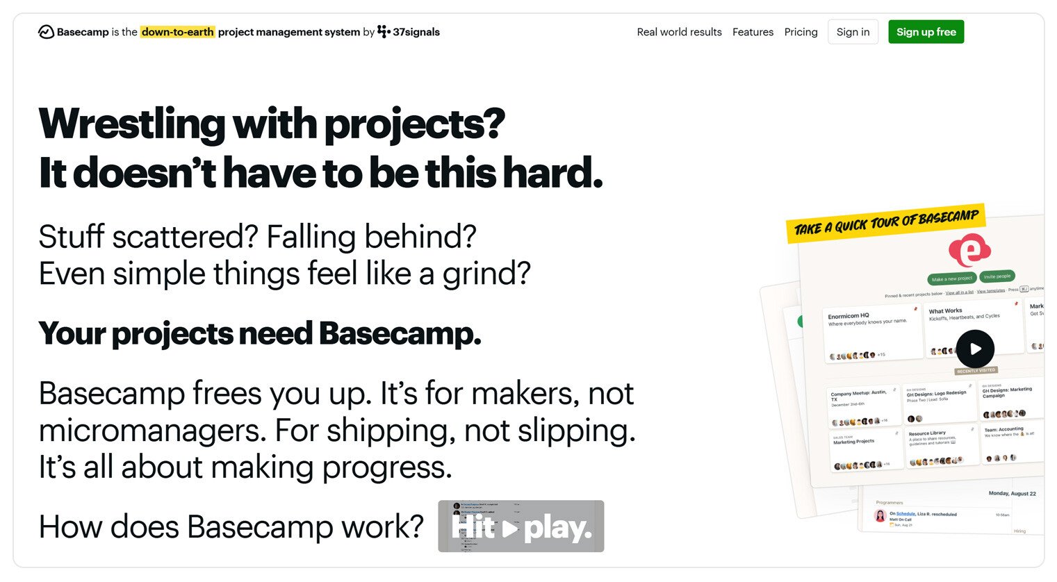 Projects in Basecamp are easy to set up and invite team members and clients to collaborate. Every project lives on a single page where everyone can find what they need and provide feedback.