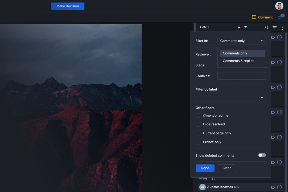 When searching for comments by reviewer, phrase, or label, you can now view replies, not just original comments. This way, you can quickly find the feedback you need to keep creative moving.