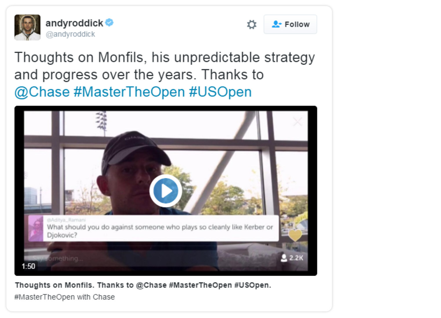 After sponsoring the US Open for more than three decades, Chase decided to try a different approach for the 2016 tournament. The company partnered with one of the most popular men’s tennis players at the time, Andy Roddick. Roddick had a huge fan base, and he would engage them (and other tennis fans) by watching games, commentating live, and hosting Q&A sessions with fans. Roddick tagged Chase in his posts, increasing exposure for the brand.