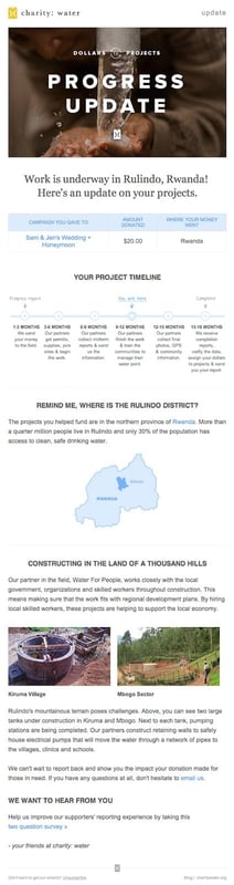 Charity: water uses email to regularly communicate with audiences and provide progress reports.