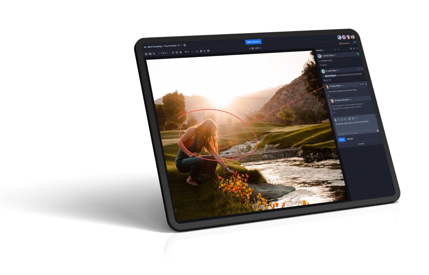 Reviewers can also collaborate within the platform to provide comments and mark up specific problem areas with precise and actionable feedback. This cuts down on miscommunication, time loss, and even rework due to missed feedback.
